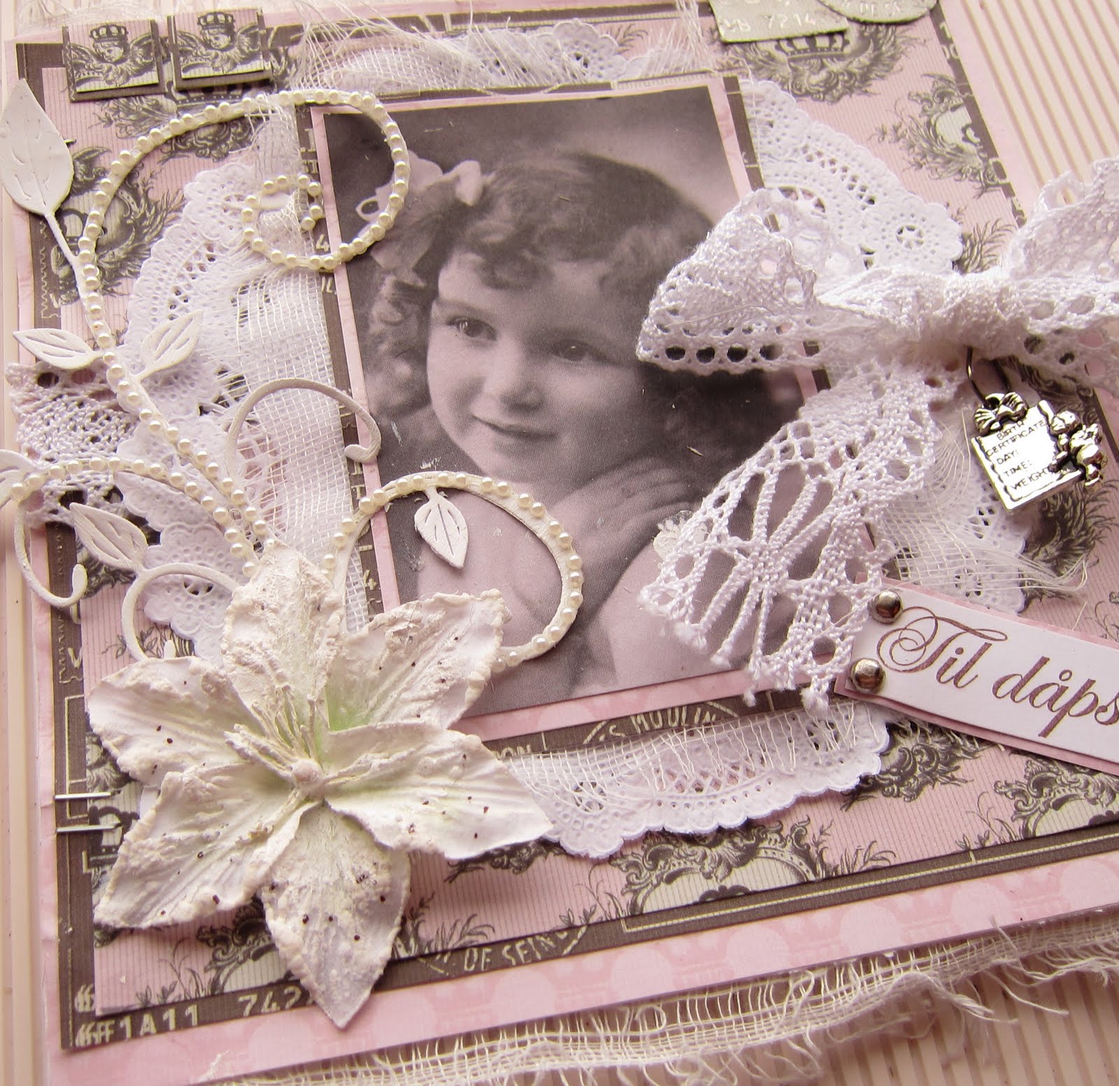 Her har jeg brukt ark i serie Bonjour fra Kaisercraft. Pyntet med kakeserviett, og osteklut. Swirlen er kuttet ut med die fra cherry lynn, som jeg har pyntet med masse små perler. Blomsten er fra Prima, og charms fra kuttut.